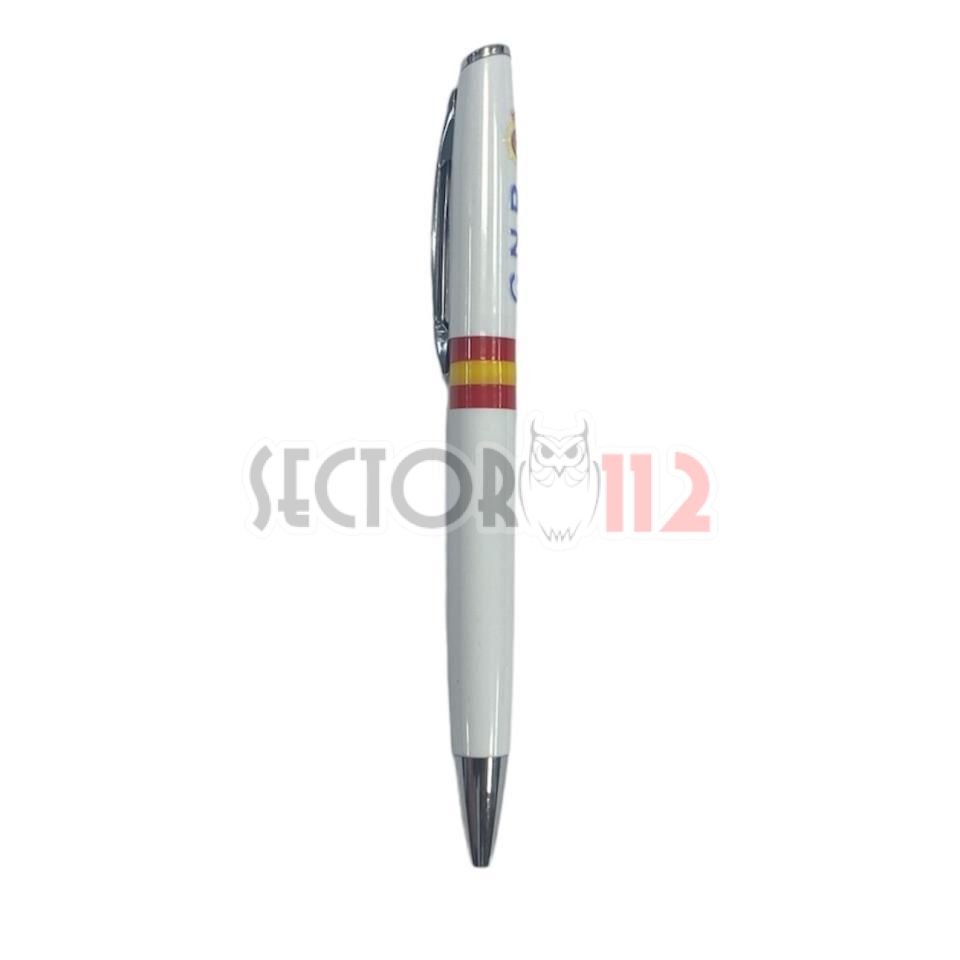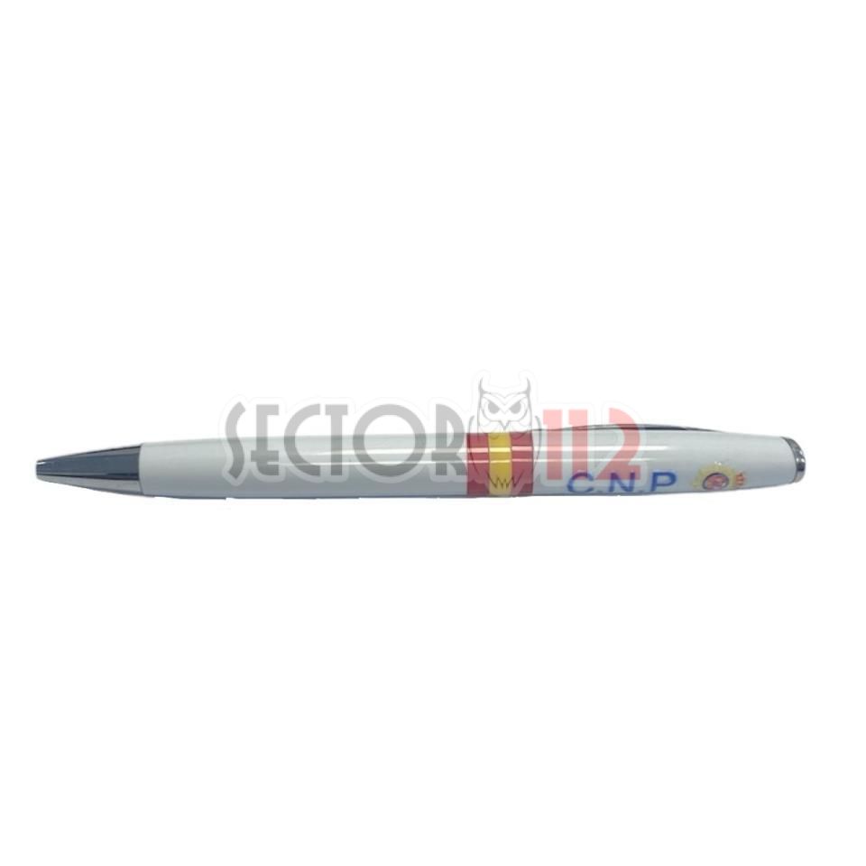 Bolígrafo personalizado con logo Policía Nacional, color blanco, tinta azul.