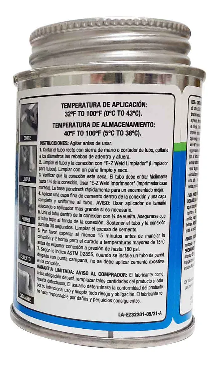 Cemento solvente de fraguado rápido marca EZ WELD modelo 222 Enviro, ideal para unir tuberías de PVC en condiciones húmedas o secas. Fórmula de baja emisión de compuestos orgánicos volátiles (Low VOC), segura para sistemas de agua potable, alcantarillado, DWV, irrigación y conducción.