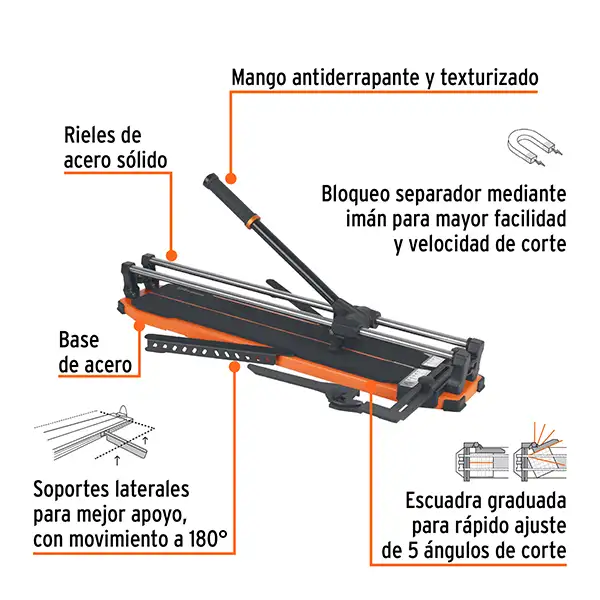 Su sistema de bloqueo de separador mediante imán permite ajustar la posición de las piezas de forma rápida y eficiente, reduciendo significativamente el tiempo de trabajo. Además, la escuadra graduada del cortador facilita el ajuste de hasta 5 ángulos de corte (0°, 15°, 30°, 45° y 60°), lo que ofrece versatilidad en diferentes aplicaciones. La capacidad de corte es impresionante, permitiendo trabajar con azulejos de 5 a 14 mm de espesor, con una longitud máxima de corte de 63 cm (25″).