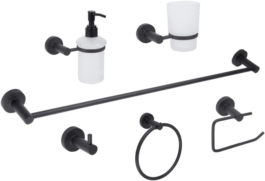 Este juego de accesorios clásicos cuenta con toallero de barra, toallero de argolla, portarrollos en C, gancho sencillo, portavaso cepillero y jabonera.