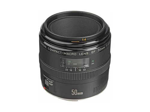 Objetivo Canon 50mm f/2.5 Compact Macro. Gracias a su tamaño y peso es considerado el macro por excelencia, fotografía general o como un objetivo estándar flexible. Ideal para cortas distancias, permite hacer primeros planos de hasta la mitad del tamaño de la imagen real.