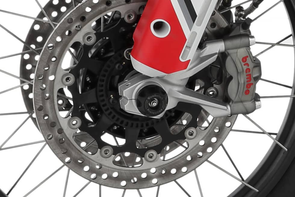 Las protecciones para eje garantizan la protección efectiva de la horquilla, el eje de la rueda y el sistema de frenos frente a daños en caso de producirse un accidente o una caída con la motocicleta.
