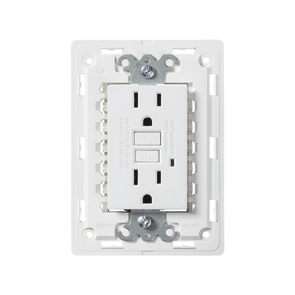 TOMA CORRIENTE DUPLEX ICFT CON CHASIS DE 3 MODULOS, COLOR BLANCO, 60HZ INTENSIDAD MAXIMA 15A, ALIMENTACION 127V, EMBORNAMIENTO CON TORNILLO